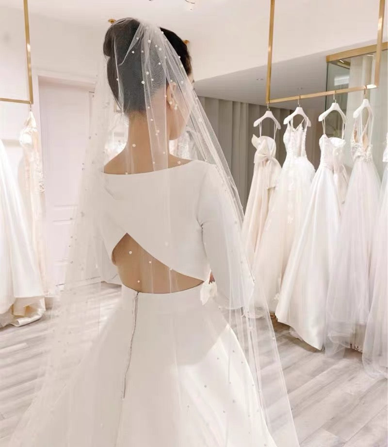 * The scattered plastic pearls are the biggest highlight for this veil, and it is particularly suitable for the plain wedding dresses without any lace design
