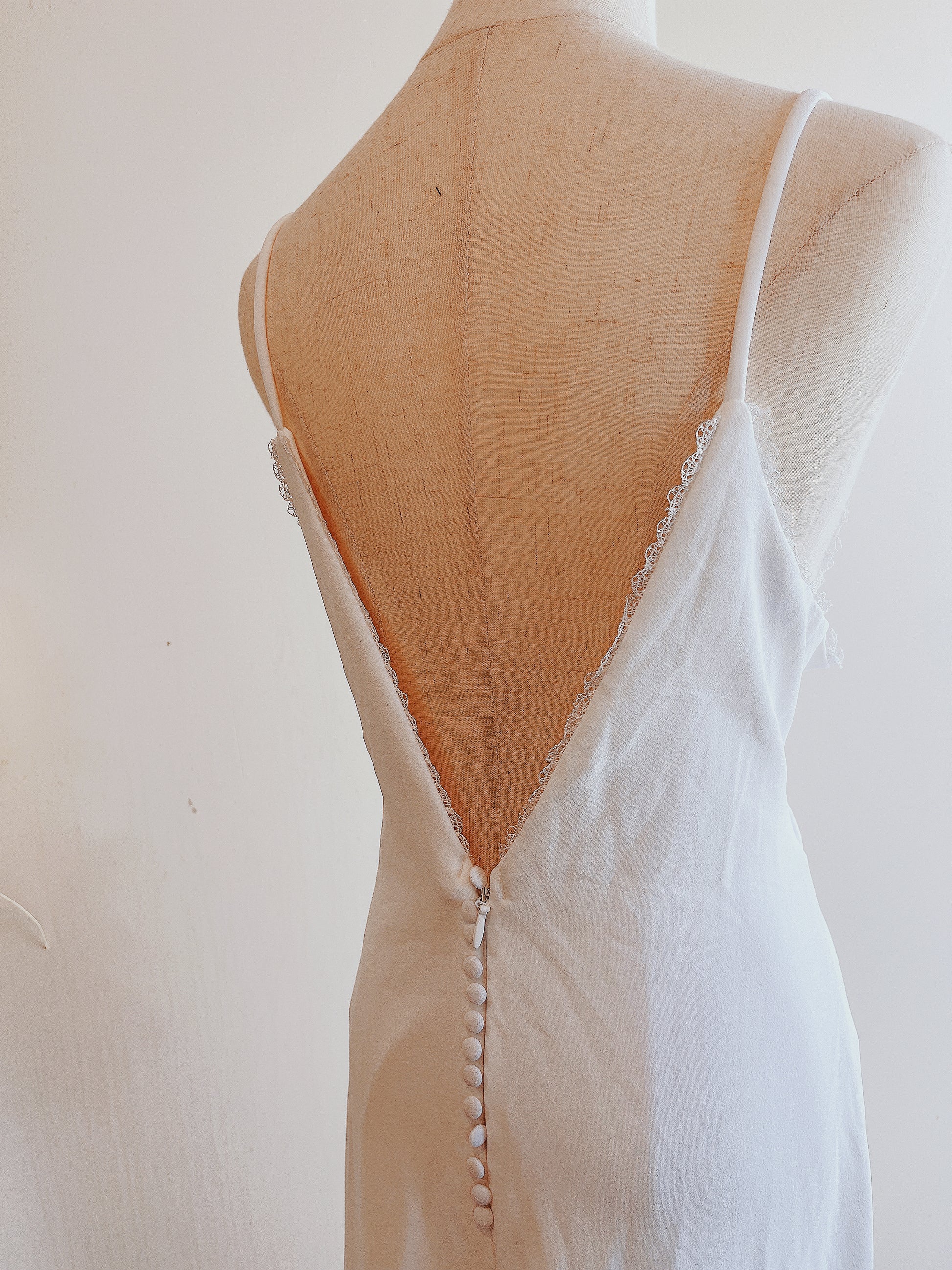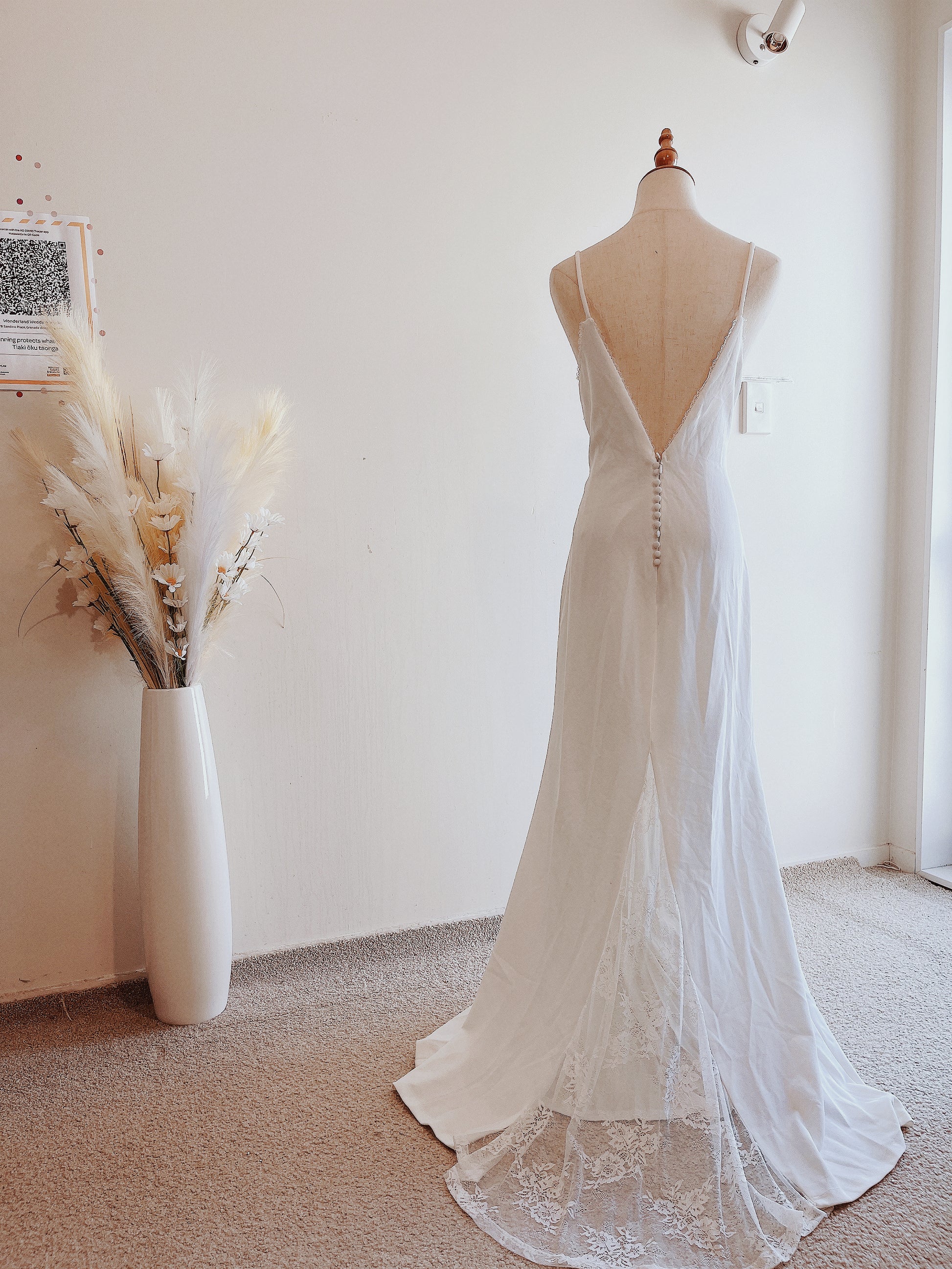 #N2022 Mnemosyne incorporates just a hint of a classic feel for a truly timeless gown. The V-neck and tapered straps highlight your décolletage and collarbone beautifully. The slinky bias cut skirt slinks over your every curve. The small lace train is her cutie highlight point.